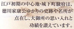 근대 일본의 중심지, 죠오카마치(※성곽을 중심으로 형성된 마을)인 순푸는 도쿠가와이에야스와 관련된 사적과 명소가 곳곳에 있고, 대장군으로서의 사상과 공적을 기리고 있습니다.