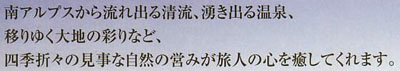 미나미알프스는 시즈오카현, 야마나시현,나가노현 3현에 걸친 대산맥으로 3000미터가 넘는 산이 13개가 있고, 그 중 10개가 시즈오카시 또는 다른 현과의 경계부분에 있습니다. 원생림을 품은 장대한 파노라마는 장엄하기까지합니다.