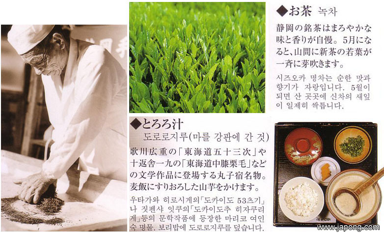 녹차 : 시즈오카의 녹차는 순한 맛과 향기가 자랑입니다. 5월이디면 산 곳곳에 신차의 새잎이 일제히 싹틉니다.